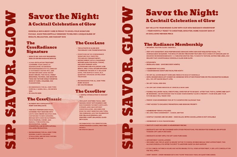 Launch specials are available only at the event. When you book a facial at Savor the Night, you’ll receive a complimentary enhancement—like Celluma LED Light Therapy or another premium add-on—to elevate your treatment even further.